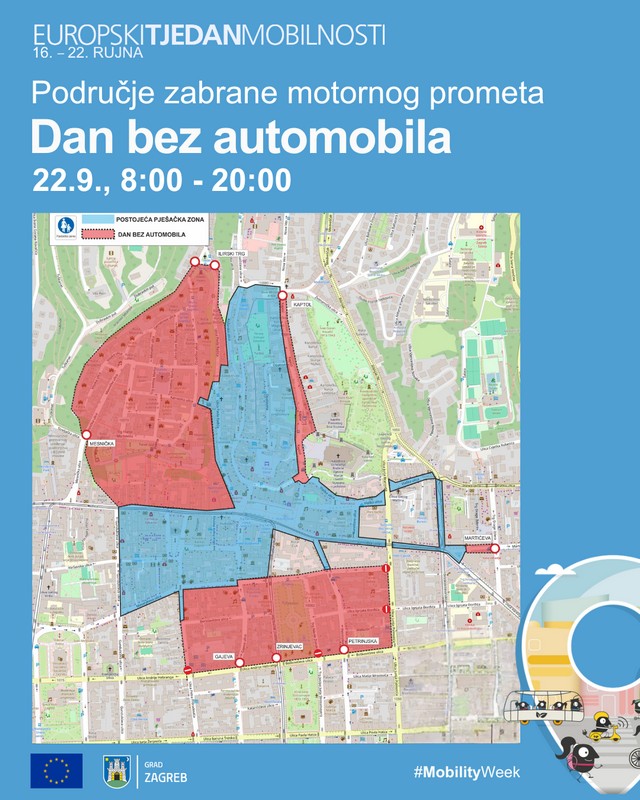 Na Dan bez automobila, 22. rujna, središte grada, područje Gornjeg i Donjeg grada, bit će zatvoreno za motorni promet od 8:00 do 20:00 sati. Promet će biti zatvoren i u Trakošćanskoj ulici, 21. rujna od 09:00 do 19:00 sati, povodom manifestacije “Trakošćanska za sve”, festivala susjedstva koji donosi bogat program za sve generacije. Istoga dana, od 7:00 do 18:00 sati, za promet će biti zatvoren i dio Ilice od Frankopanske do Krajiške ulice zbog održavanja festivala Q’art.