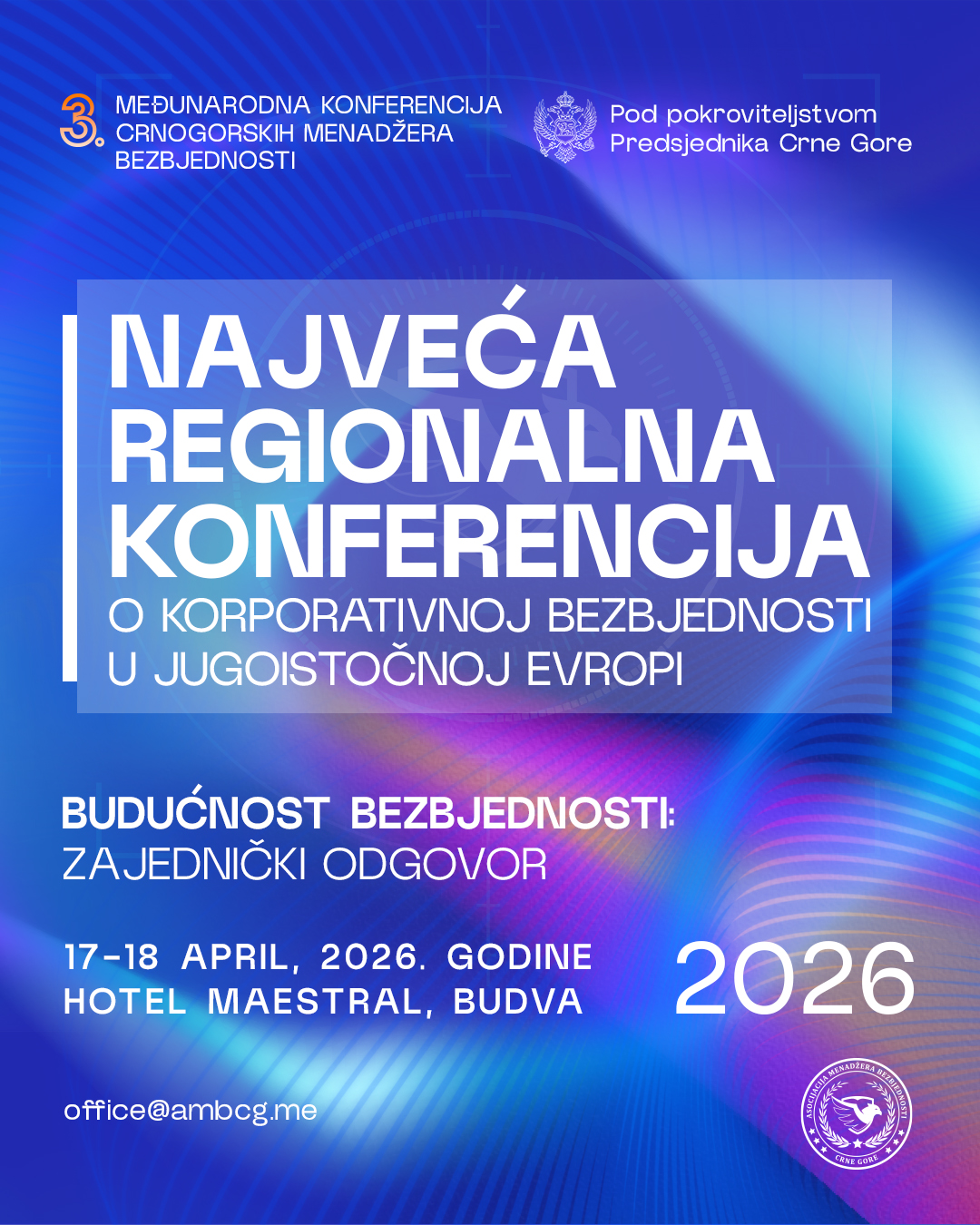 Treća međunarodna konferencije crnogorskih menadžera sigurnosti pod nazivom "Budućnost sigurnosti: zajednički odgovor" održat će se 17. i 18. travnja 2026. godine u hotelu Maestral Resort&Casino u Pržnu kod Budve, uz pokroviteljstvo Predsjednika Crne Gore Jakova Milatovića.