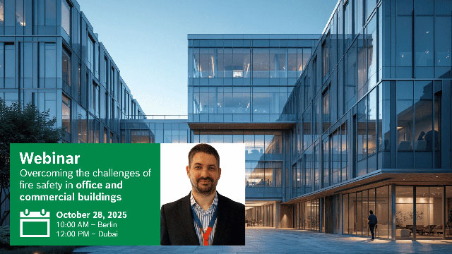 Robusna i besprijekorno integrirana detekcija požara ključna je za zaštitu zaposlenika, posjetitelja i vrijedne imovine. Boschevi sustavi za detekciju požara štite uredske i poslovne zgrade, a istovremeno osiguravaju kontinuitet poslovanja i štite ugled vaše tvrtke. Pridružite se Boschevom webinaru kako biste otkrili kako Boscheva sigurnosna rješenja stvaraju sigurnija radna mjesta.